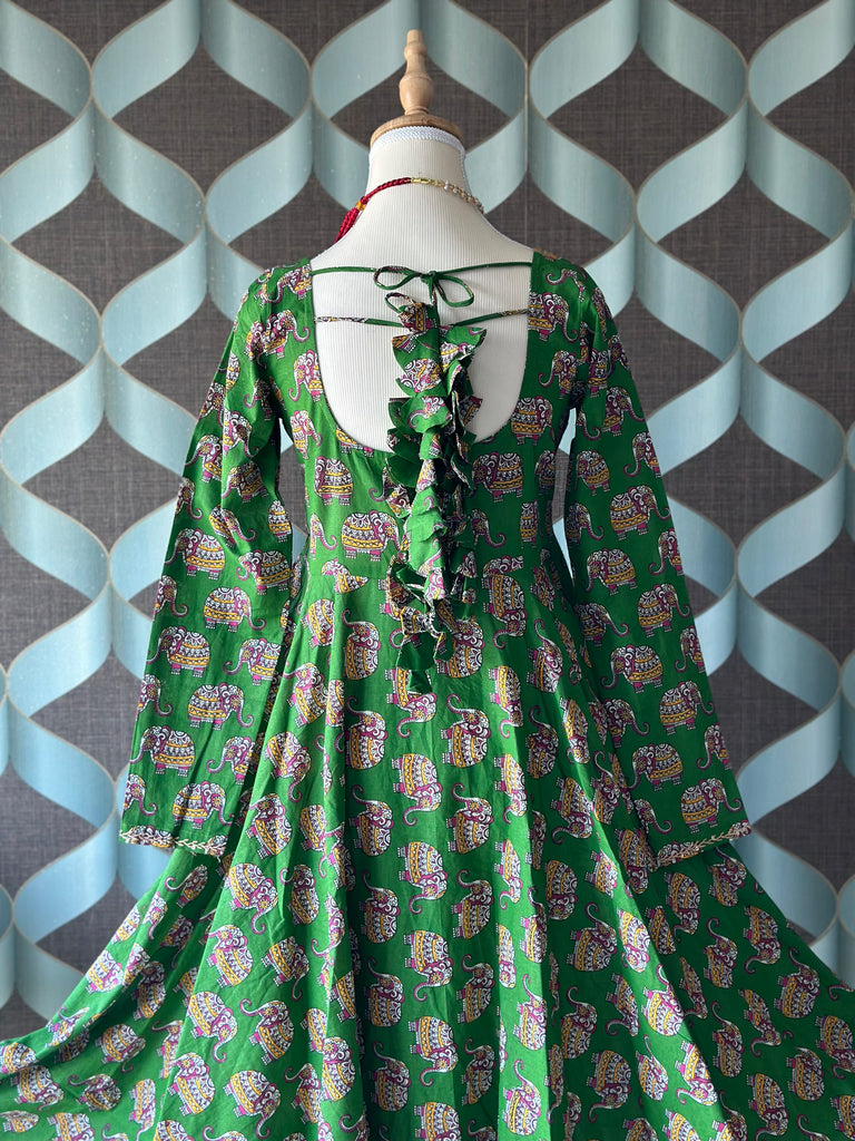 Step into effortless elegance with this vibrant green Anarkali crafted from 100% breathable cotton. Featuring a playful elephant block print, this piece blends traditional artistry with modern comfort.